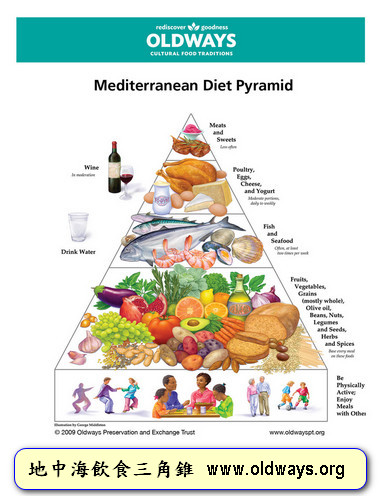 = 紅肉 及 甜點:每月 = 雞鴨,乳製品 及 紅酒:每週 = 魚與海鮮:每天 = 主食:蔬菜,水果,堅果,全穀物,橄欖油等